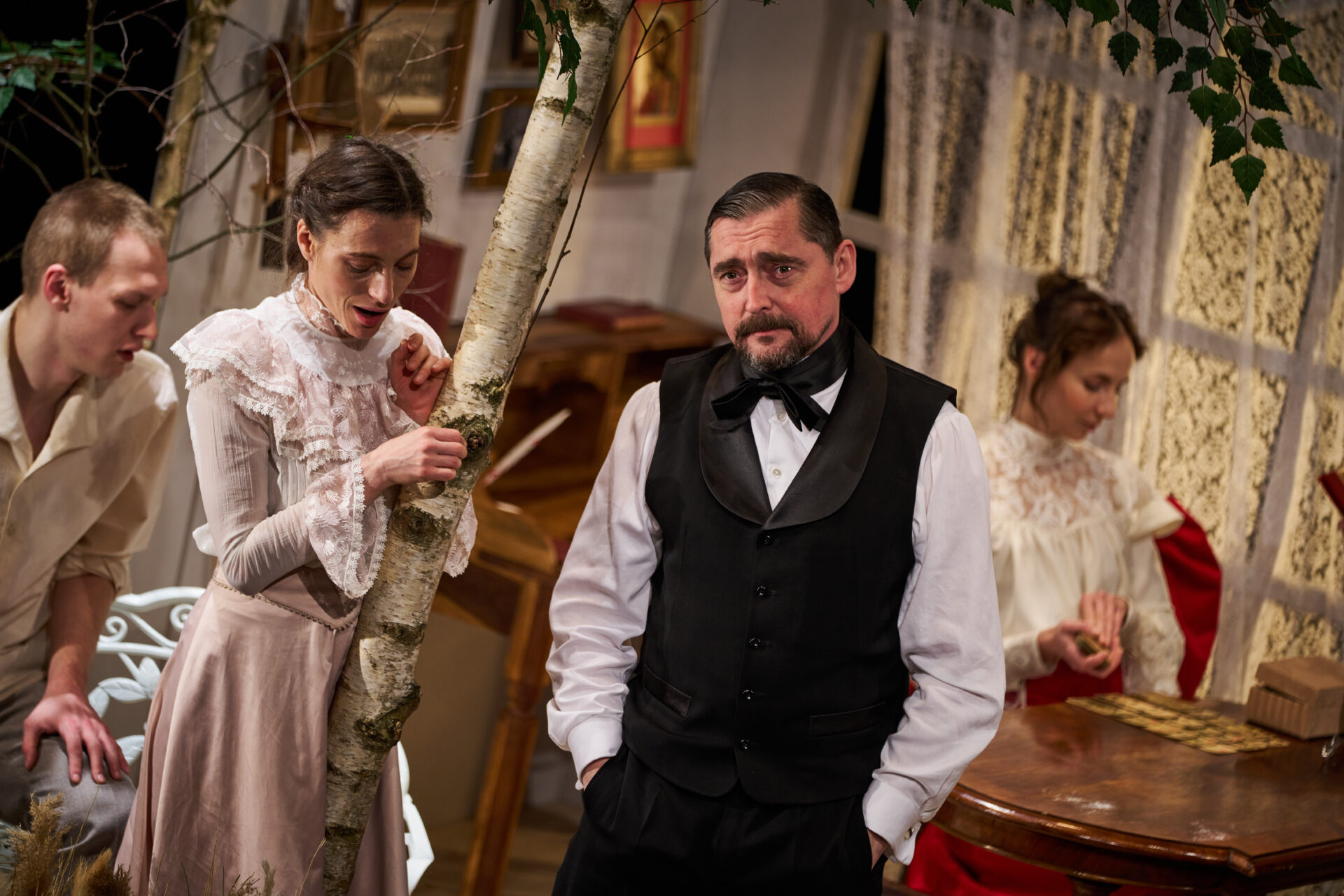 Čechovova ikonická hra rozvíjí téma neopětované lásky a milostného konfliktu i umělecký spor mezi mladou, nadějnou, experimentující generací a tou stárnoucí, legendární. Navzdory stáří hry jde o stále pulsující text, který v režii Jiřího Havelky ožívá ve výrazném výtvarném pojetí scénografa Dády Němečka.